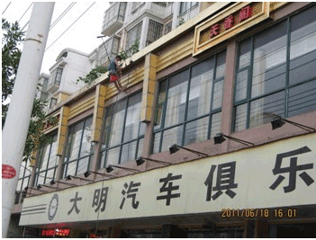 迪邦保潔公司人員正在為“大明汽車俱樂部”做外墻玻璃清洗。
